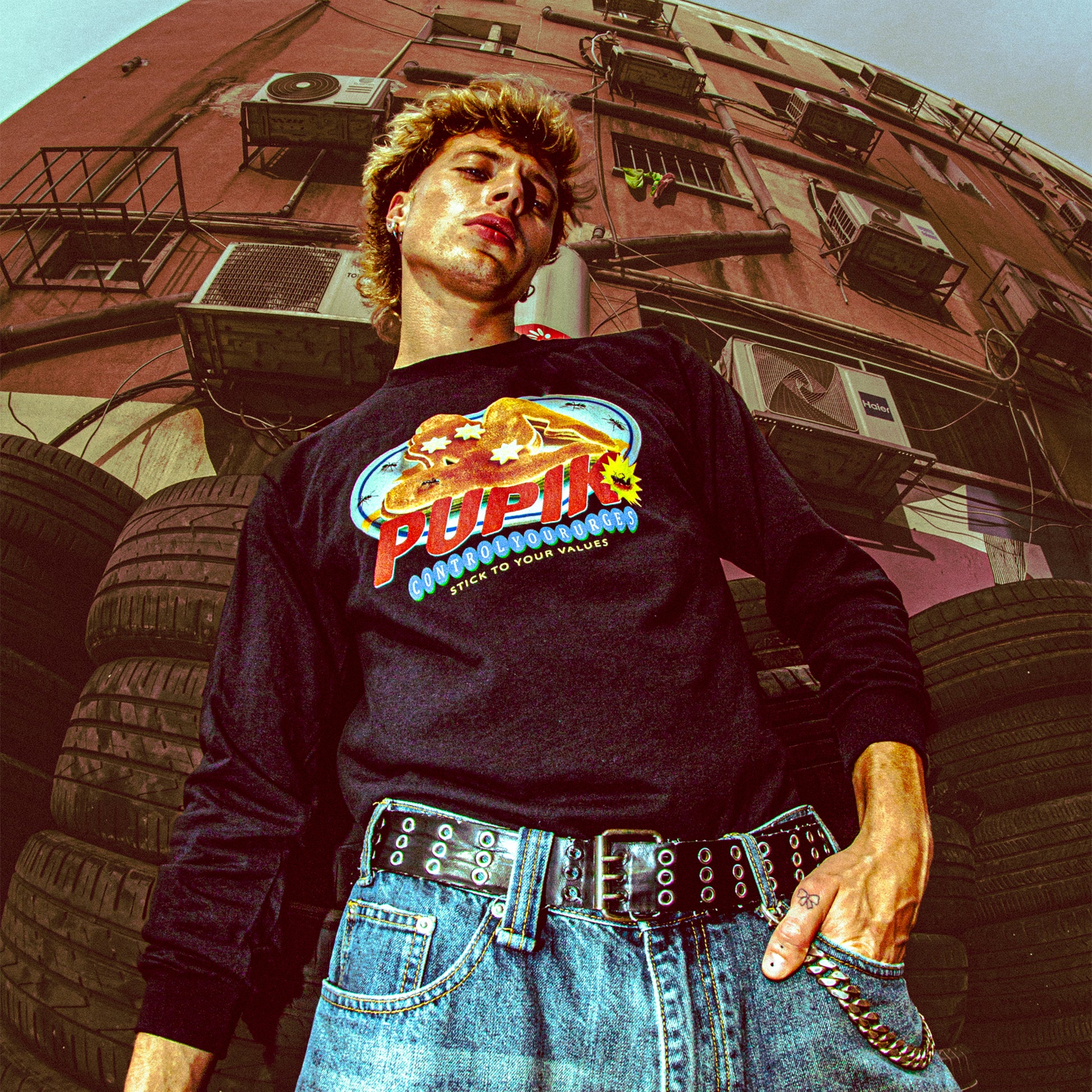 A white long-sleeve heavy-weight cotton shirt featuring a bold Pupik graphic on the front. Finished with a custom Pupik neck label and printed in vibrant colors. Slightly oversized fit.